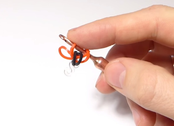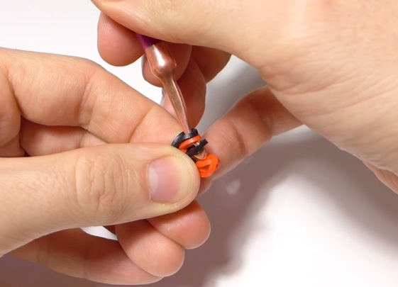 - Ni prenas nigran kaŭĉukon, metu ĝin sur la pinton de la hoko kaj streĉu ĝin. Ni nun trenas ĝin tra la unua oranĝa buklo, kiu estas sur la hoko.